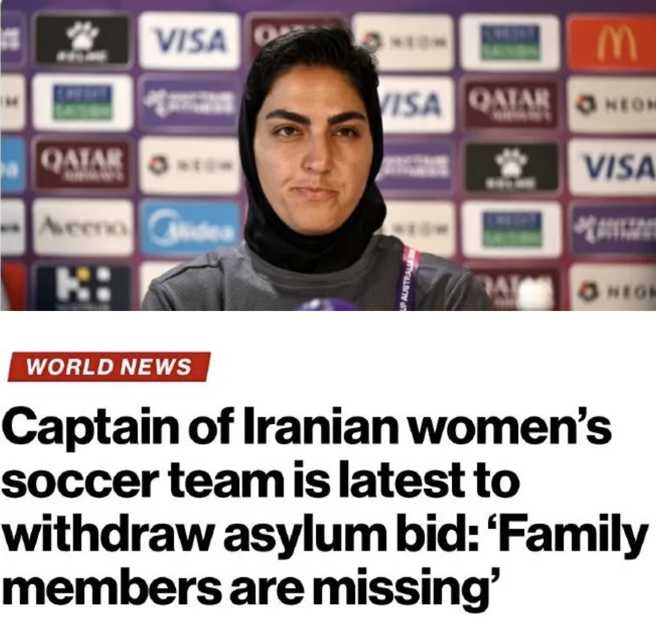 今日,3名留在澳大利亚的伊朗女足成员中,又有1人决定离开。英媒《每日邮报》、伊朗国际电视台、澳大利亚ABC等多家媒体指出,伊朗女足队长甘巴里已经撤回庇护申请,并在昨日连夜乘坐飞机回国。