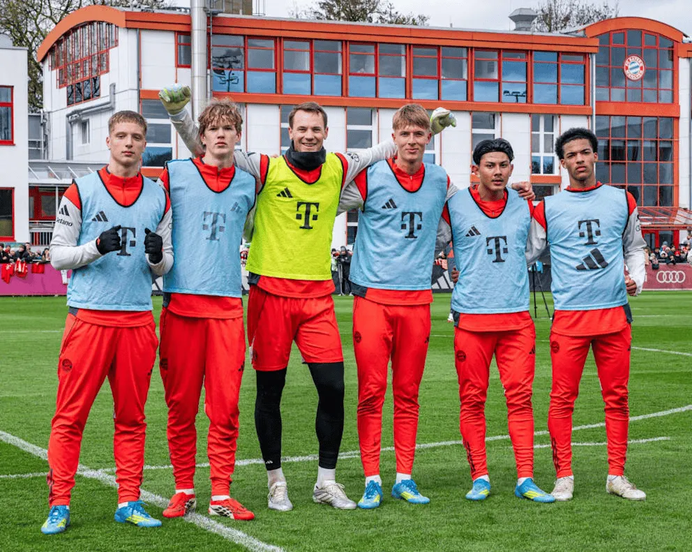 虎扑04月01日讯 当地时间周二训练结束后,拜仁队长曼努埃尔-诺伊尔与五位年轻球员留下了一张特殊的合影。这位周五刚度过40岁生日的世界杯冠军门将笑容满面,而他身旁的五位年轻人,只有拜仁的铁杆球迷才认识。